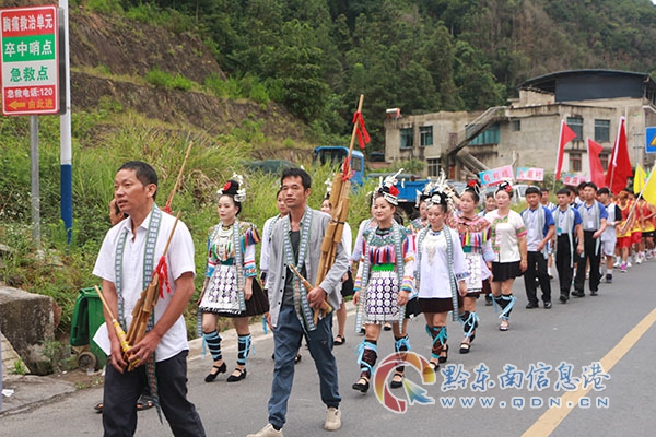 表演隊、裁判員、運動員組成游行隊伍,從九潮中學一路前行到九潮中心小學,全體人員精神抖擻、昂首挺胸闊步前行,展示出參與賽事的熱情、活力及精神面貌。