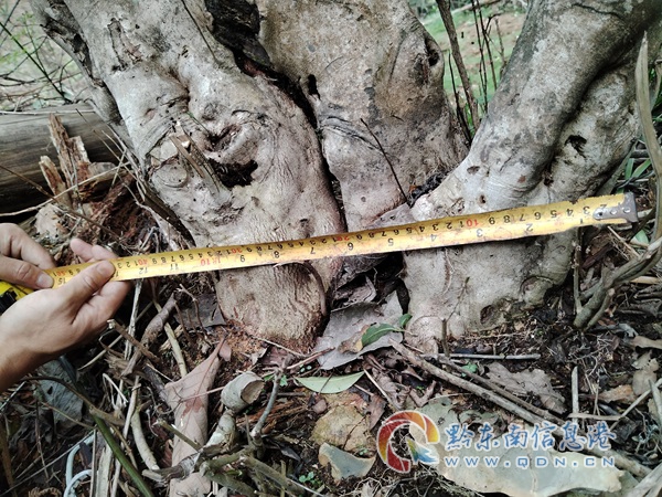 該野生古茶樹的發現地點位于海拔1045米的雷公山大半山腰處,茶樹一老樁有三分枝,它們相互依偎,植株總體向上伸展,樹葉為長橢圓形,葉脈清晰、葉緣有鋸齒,為小喬木型。現場測量數據顯示,整體樹干胸圍超121厘米,最大分枝樹干胸圍超53厘米、直徑21厘米,最高處距地面超過3.5米,其余2個分枝分別為直徑10厘米和14厘米。