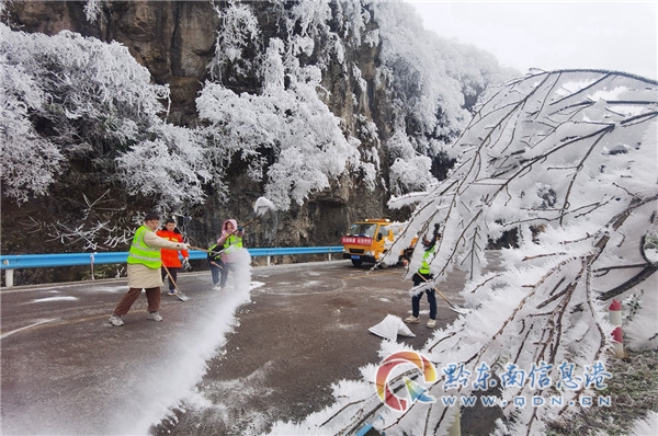 2024年2月23日,受寒潮低溫凝凍天氣影響,鎮遠縣境內的國道211線高海拔路段的路面結冰,影響行車安全。鎮遠公路管理段職工及時上路撒融雪劑除冰工作,救助受困車輛,確保道路暢通和群眾安全出行。(熊江波 陸曉穎 攝)