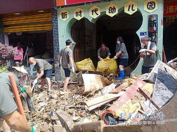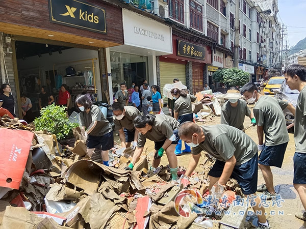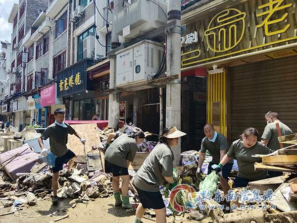 災后清理,最大的難點在街道垃圾堆和河道低洼區域,垃圾多而亂,氣味很難聞,大部分機器無法到達,只能通過人工處理。女民兵們有的手拿鐵鍬清理,有的直接用手拉、扯、提,她們毫不退縮,毫不猶豫,動作利落。她們不怕臟、不怕累、不怕苦,勇敢頑強。在連續7天的惡劣環境中,她們每天準時到崗,不完成任務誓不撤退,與全縣民兵隊伍一起完成縣醫院、步行街、和平街、鎮江閣、楊柳灣等區域災后清理。