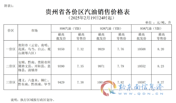 根據成品油價格形成機制,國家發展改革委決定自2025年2月19日24時起下調國內成品油價格。按照國家調整要求和相關規定,貴州省89#汽油(國VIB)、0#柴油價格每噸在現行標準基礎上分別降低170元、160元,具體價格可由各經營企業在不超過最高批發、零售價格的前提下確定。調整后各油品最高價格見附件。