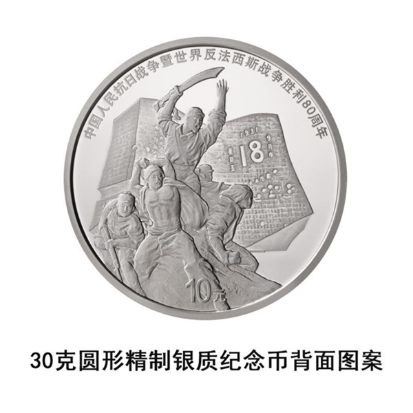 30克銀幣背面圖案由“大刀進行曲”雕塑、“九·一八”歷史博物館“殘歷碑”雕塑等元素構成,寓意“九·一八”事變后,中國人民奮起抵抗,成為中國人民抗日戰爭的起點,同時揭開了世界反法西斯戰爭的序幕。該枚紀念幣直徑40毫米,面額10元,最大發行量2萬枚。