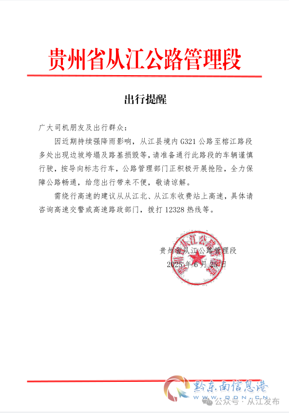 因近期持續強降雨影響,從江縣境內G321公路至榕江路段多處出現邊坡垮塌及路基損毀等,請準備通行此路段的車輛謹慎行駛,按導向標志行車,公路管理部門正積極開展搶險,全力保障公路暢通,給您出行帶來不便,敬請諒解。