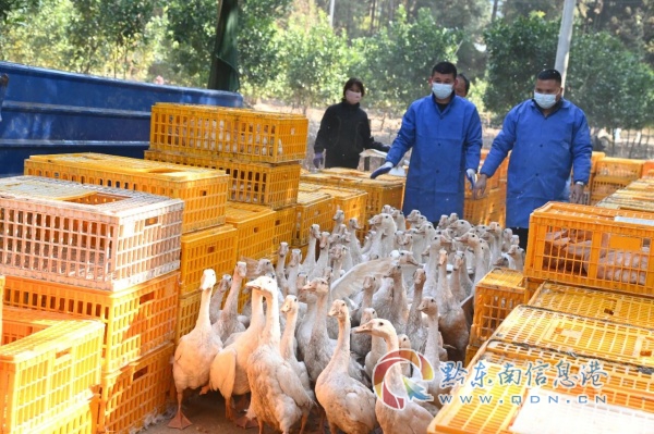 大鵝出欄現場,工作人員正有條不紊地鋪設著“鵝道”,為大鵝出欄做準備。隨著運輸車輛的到來,全體工作人員分工協作,工人們手持工具,熟練而有序地驅趕著白鵝走出圍欄。抓鵝、裝鵝、計數、登記、稱重……動作緊張迅速、簡潔高效,提高了運輸成活率,確保出欄大鵝品相優良。這批出欄的白鵝,平均每只重量達7斤,品質上乘。由貴州錦屏生態鵝業發展有限公司以10元/斤的價格統一上門收購,這一筆交易將為農戶帶來5萬余元的增收。