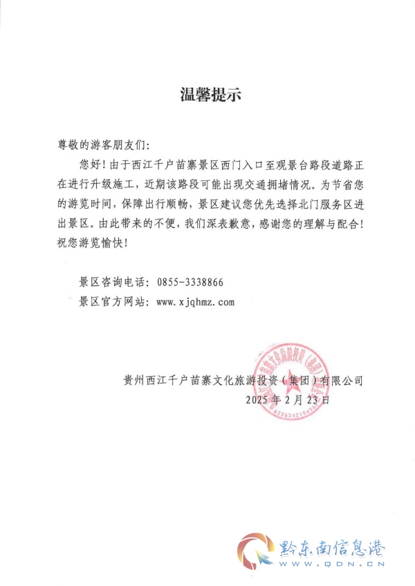 關于西江千戶苗寨景區西門路段道路施工的公告
