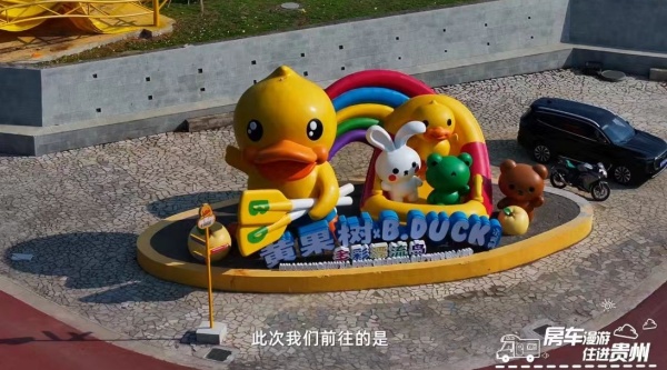 翌日,房車載著我們奔赴一場更親水的約會——黃果樹×B.Duck小黃鴨多彩漂流樂園。黃果樹小黃鴨主題漂流樂園,位于黃果樹天星橋至郎宮半島的黃金路線,漂流河段全長4.2公里。它以B.Duck小黃鴨為主題,將萌趣可愛的潮玩IP植入青山綠水之間,打造了國內首個“自然奇觀+潮玩IP”的文旅新玩法,是一場適合全家歡享的沉浸式主題狂歡。穿上救生衣,躍上俏皮的小黃鴨漂流艇,河道瞬間變成歡樂水道。