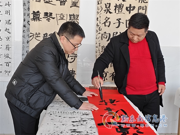 19日上午,學校書法社團楊維卓、周宗彥、楊勝法、王太來、潘盛煥幾位老師在學校書法室為全體教職工手寫對聯,送上祝福。活動現場,墨香四溢,氣氛熱烈。書法老師們神情專注,揮毫潑墨,在紅紙上精心創作了一幅幅寓意吉祥、飽含祝福的對聯。“春風化雨潤桃李,心血融情育棟梁”,對仗工整,寓意深刻,贊美了老師們的辛勤耕耘與無私奉獻,“金玉滿堂百業旺,富貴平安萬事興”是對新年幸福生活的憧憬和期待。