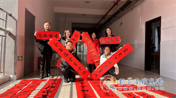 教師們積極協助,有的幫忙鋪紙研墨,有的傳遞對聯,大家分工明確,配合默契。一幅幅對聯擺滿桌面、地面,恰似一片紅色的海洋,洋溢著濃濃的節日氛圍。