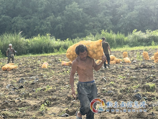 在金黃色的陽(yáng)光照耀下,整個(gè)田野宛如一片希望的海洋。一壟壟土地被翻開(kāi),圓滾滾、黃燦燦的馬鈴薯接連不斷地從土壤中滾落出來(lái),個(gè)個(gè)體態(tài)飽滿,令人賞心悅目。村民們穿梭其間,臉上洋溢著豐收的喜悅,忙碌而充實(shí)。他們分工有序,男同志們身強(qiáng)力壯,一人便能扛起一袋約70斤重的馬鈴薯,邁著穩(wěn)健的步伐將其送往裝車地點(diǎn);女同志們也不甘示弱,兩人一組默契配合,輕輕松松便能將一袋袋馬鈴薯提起,裝上卡車。與一旁正在休息喝水的吳貴菊阿姨交談了解到,她說(shuō):“今天一天就挖了20多畝的馬鈴薯,這掛刀坪的土豆品質(zhì)真是一年比一年好。而且這產(chǎn)量也相當(dāng)可觀,按照這個(gè)進(jìn)度,剩下的收尾工作很快就能完成,這豐收是穩(wěn)穩(wěn)的了。”