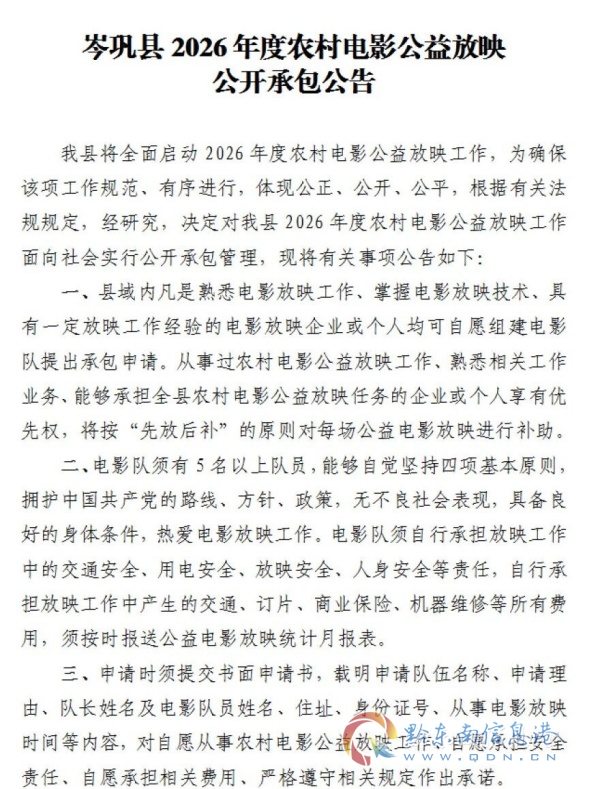 岑鞏縣2026年度農(nóng)村電影公益放映公開(kāi)承包公告
