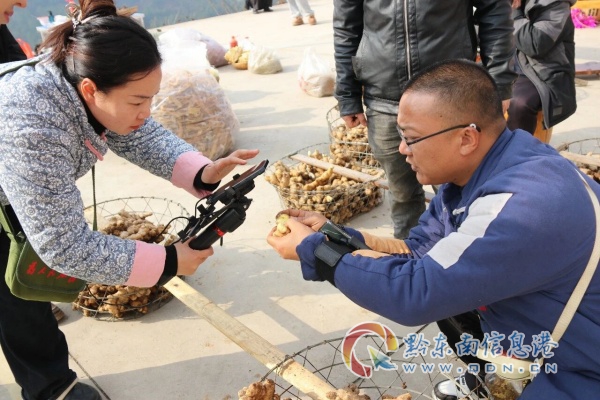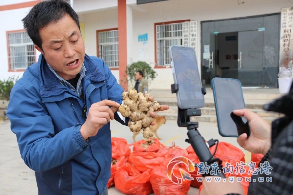 “大家看過來!這是剛從姜窖拿來的凱里旁海生姜,今天直播間全部原產地直供!”