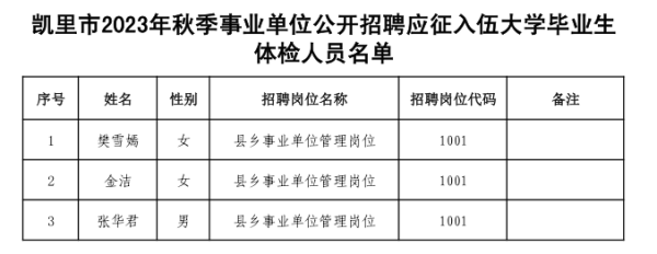 附件:凱里市2023年秋季事業單位公開招聘應征入伍大學畢業生體檢人員名單