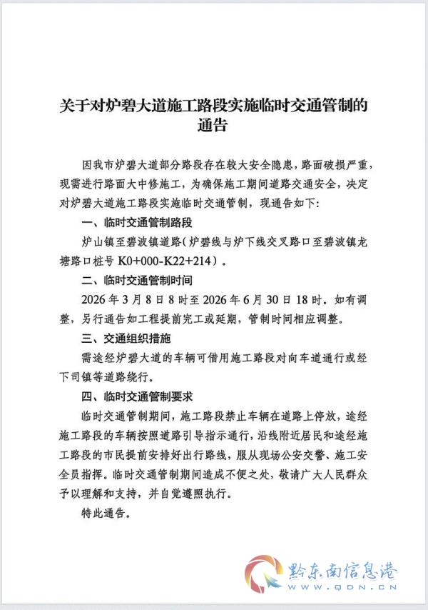 關于對爐碧大道施工路段實施臨時交通管制的通告