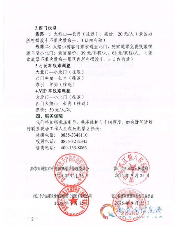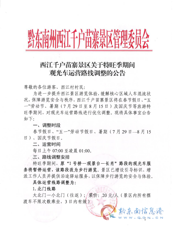 西江千戶苗寨景區(qū)關(guān)于特旺季期間觀光車運營路線調(diào)整的公告