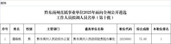 根據《黔東南州直屬事業單位2025年面向全州公開遴選工作人員實施方案》的規定,經報名、筆試、資格復審、面試、體檢、考察等程序,現將黔東南州直屬事業單位2025年面向全州公開遴選工作人員第十批擬調動人員名單予以公示(詳見附件)。