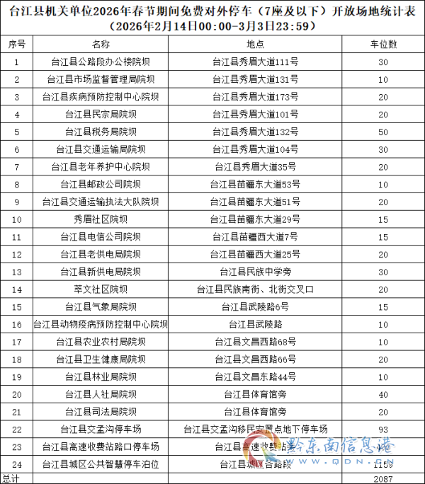 附件:臺江縣機關單位2026年春節期間免費對外停車