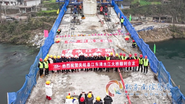 2月7日上午,隨著最后一方混凝土澆筑完成,天柱縣江東清水江大橋順利合龍,標志著大橋主體結構施工取得決定性勝利,為項目建成通車奠定堅實基礎。