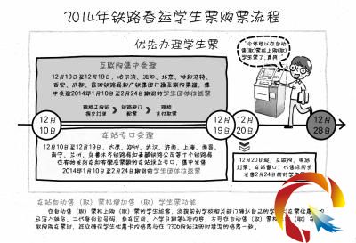 (2)車站�?谑芾恚鹤�2013年12月10日至12月19日,在有固定始發(fā)列車和有硬座票額的車站設立專口,集中發(fā)售2014年2月24日前的學生團體往返票。