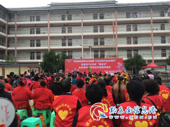 活動通過宣傳展示、節日慰問、文藝演出等形式讓福利院老人感受老年文化的豐富多彩,讓其身心愉悅。出席活動的領導對福利院老人送上了重陽節的祝福并送上為老人們定制的節日慰問紀念品保溫杯,讓老人歡樂溫暖的過節。文藝演出在舞蹈《吉祥西藏》中拉了開序幕,接著舞蹈《鎖千秋》《天竺少女》《洗衣舞》等精彩表演,隨后凱里十二小的師生帶來《三德歌》在這個傳統佳節重陽節來領之際給福利院的來人們送來他們的節日祝福;最后彩虹社工與福利院的老人帶來的歌曲串燒《萍聚》+《常回家看看》,動情的演唱感動現場的老人們和觀眾。彩虹社工與福利院老人結緣于2017年三區計劃項目,項目通過一年的開展,社工的服務得到了院內老年人的認可,老人與社工建立了深厚的感情,此次彩虹社工再次回到福利院陪伴老人一起過重陽節,并攜手院內老人一起合唱《常回家看看》表達了社工對老人的思念和祝福,活動現場,老人們留下了激動的淚水,一位老人緊緊拉住社工的手說:“你們要經常回來看看我們,常回家看看....”。