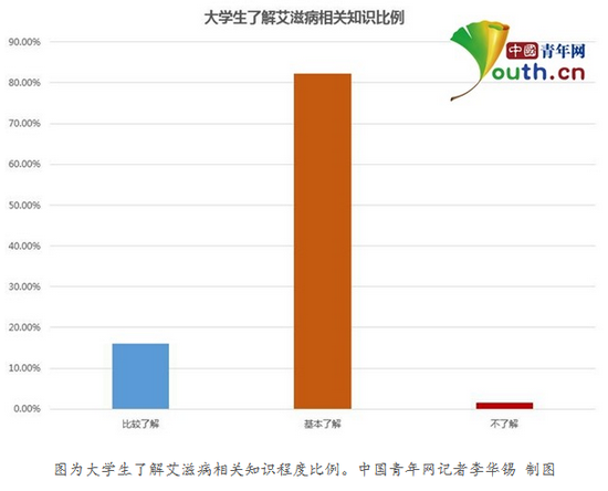 在第31個“世界艾滋病日”即將到來之際,中國青年網對全國1606名大學生進行了問卷調查,結果顯示:仍有1.56%的大學生對艾滋病不了解,近9成大學生獲得艾滋病知識途徑是網絡,近4成大學生認為學校有關預防艾滋病的教育宣傳活動“宣傳力度不夠,有待加強”,超8成大學生希望了解艾滋病的預防措施和治療方法,超7成大學生“愿意正常對待艾滋病患者,并給予幫助”,知識普及講座、開展校園活動、網絡新媒體教育是受大學生歡迎的艾滋病知識宣傳方式。