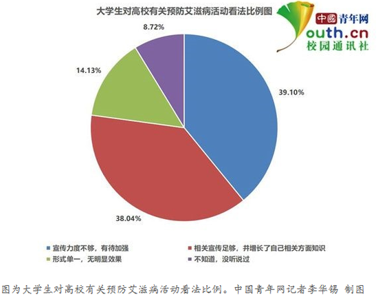 在中國青年網的調查中顯示,有近7成的大學生是通過學校教育了解到艾滋病知識。那么,同學們對于學校有關預防艾滋病的活動有什么看法呢?調查顯示,39.1%的學生認為“宣傳力度不夠,有待加強”,38.04%的學生認為“相關宣傳足夠,并增長了自己相關方面知識”,認為“形式單一,無明顯效果”和“不知道,沒聽說過”的學生各占14.13%、8.72%。