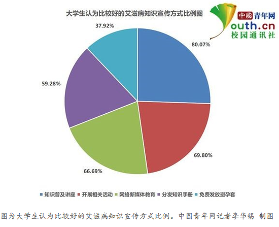 在調查中,80.07%的大學生認為比較好的艾滋病宣傳方式是“知識普及講座”,其次為“開展相關活動”和“網絡新媒體教育”,各占69.8%、66.69%。