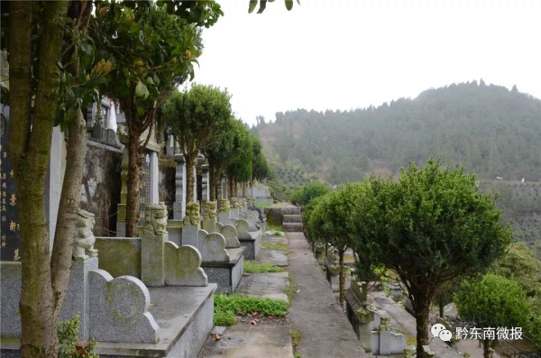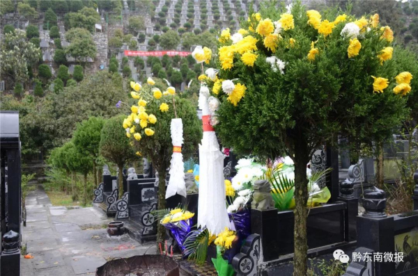 記者走進凱里市二龍公墓、九寨公墓發現,進入公墓園區的路段每隔一段距離都懸掛或豎立著醒目的倡導文明祭祀的標語:“倡導文明祭祀 新時代樹新風”等內容;一座座墓碑前,擺放著的一束束黃白相間的菊花,顯然已經成為了主流的祭掃用品。