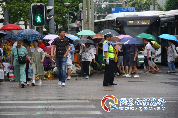6月7日,民警在考點(diǎn)附近指揮車輛