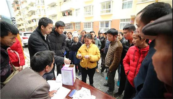 從江縣下江鎮易地扶貧搬遷安置點搬遷戶在抽取門面經營權(錢仕豪 攝)