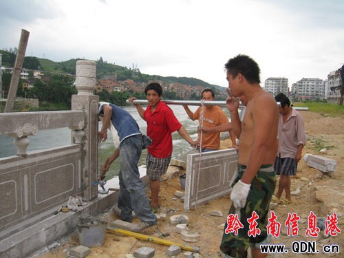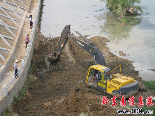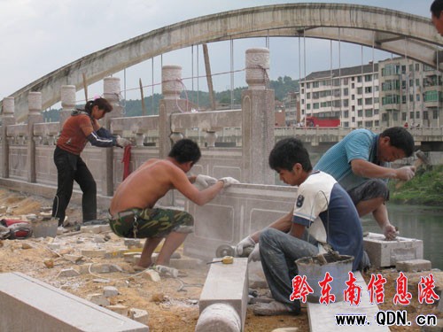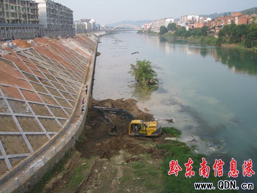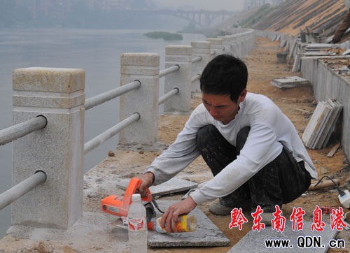 本港訊 (特約記者 張維軍 攝影報道)連日來,在岑鞏縣城舞陽河段,機聲隆隆,技術工人們冒著烈日酷暑,揮汗如雨,有的在開挖掘機推土,有的在用攪拌機攪拌砂漿,有的在河堤上砌觀景臺,有的在切割安裝大理石護欄……