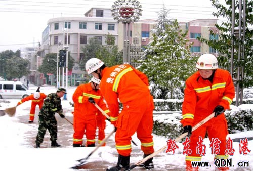 17、18日,連續兩個晚上,岑鞏縣境普降大到暴雪。據測量,19日縣城區積雪最高厚度達到16厘米,大街小巷全被積雪覆蓋,群眾出行不便。至記者發稿時,該縣天空仍在紛紛揚揚地下著大雪。為了方便廣大市民出行,連日來,岑鞏縣組織交通、市政、消防等部門的干部職工走上大街小巷奮力掃除道路積雪。圖為19日上午該縣市政局干部職工和消防大隊的20余名官兵在奮力除雪的情景。(張維軍)