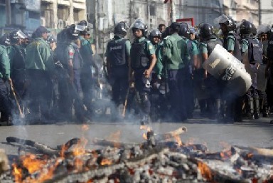 圖為孟加拉警方列陣阻止暴怒的投資者前進,警方身前是抗議投資者點燃的火堆。