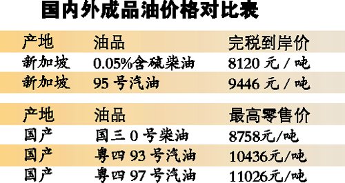 記者昨天了解到,按照發(fā)改委對成品油最高銷售價(jià)的有關(guān)規(guī)定,目前廣州93號(hào)汽油的最高零售價(jià)是10436元/噸,而97號(hào)汽油的最高零售價(jià)是11026元/噸。即便是參照93號(hào)汽油最高零售價(jià),從新加坡進(jìn)口一噸95號(hào)汽油,加上運(yùn)費(fèi)和其他費(fèi)用,完稅到岸價(jià)才9446元,理論上的凈利潤空間高達(dá)990元;如果參照97號(hào)汽油,從新加坡進(jìn)口一噸汽油的理論利潤高達(dá)1580元;而進(jìn)口一噸新加坡0.05%含硫柴油的利潤,為每噸638元。