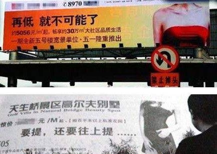 與這句廣告語(yǔ)相配的圖案,是一個(gè)靚女用手微微撩起紅色短裙,隱隱露出大腿。這則廣告與“再低,就不可能了�!钡膹V告語(yǔ)遙相呼應(yīng),一個(gè)是不能再低了,一個(gè)卻還要往上提,從胸脯到大腿,開(kāi)發(fā)商絞盡腦汁依然與情色糾纏。