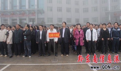 本港訊 (特約記者 黃曉海 攝影報道)為慶祝新中國成立61周年,10月1日,貴州省黔東南苗族侗族自治州丹寨縣的干部職工、中小學生、武警官兵、公檢法干警等各界代表近2000千余人在縣城行政中心廣場舉行升國旗唱國歌儀式。丹寨縣委書記古鵬,縣人大常委會主任駱玉明,丹寨縣委副書記、縣長龍先金,縣委常委、宣傳部長李永勝,縣委常委、縣紀委書記陳光洲,縣委常委、縣人武部部長阮東兵,縣委常委、縣委組織部長劉明波等縣委、政府各級領導參加了升旗儀式。升旗儀式由縣委常委、宣傳部長李永勝主持。