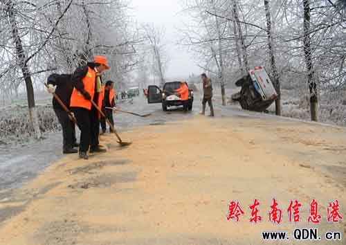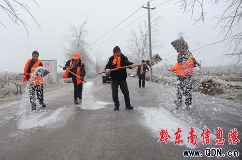 1月2日,貴州省丹寨縣,公路養護人員在鋪撒防滑木渣。