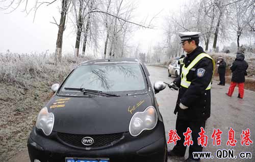 1月2日,貴州省丹寨縣,交警在提醒過往司機小心駕駛。
