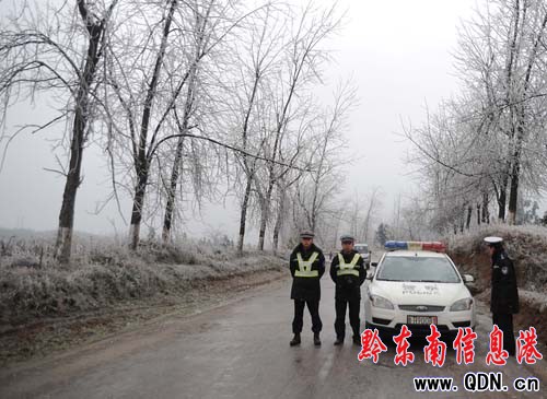 1月2日,貴州省丹寨縣,交警在冰凝路段執勤。