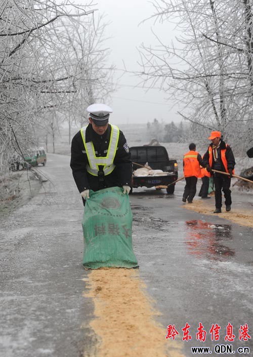 1月2日,貴州省丹寨縣,一名交警在鋪撒防滑木渣。