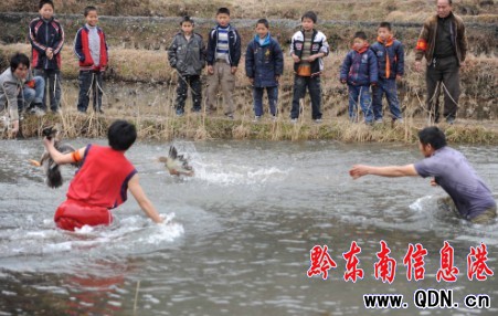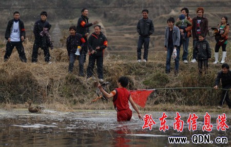 2月7日,貴州省丹寨縣揚(yáng)武鄉(xiāng)干改村,一名參賽選手在水田里捉鴨子。