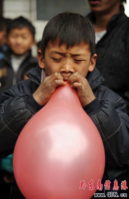 2月7日,貴州省丹寨縣揚(yáng)武鄉(xiāng)干改村,一名苗族小男孩在進(jìn)行吹氣球比賽。