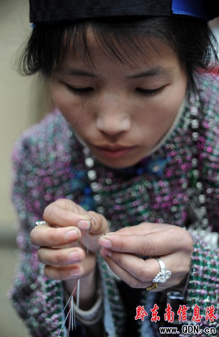 2月7日,貴州省丹寨縣揚(yáng)武鄉(xiāng)干改村,一名苗族村民在進(jìn)行穿針比賽。