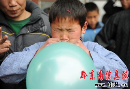 2月7日,貴州省丹寨縣揚(yáng)武鄉(xiāng)干改村,一名參賽選手在進(jìn)行吹氣球比賽。
