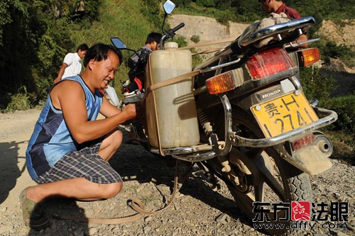 據東方法眼消息 連日來,一支由共產黨員、入黨積極份子和青年團員10多人組成的摩托車運水隊,來回奔波在貴州省丹寨縣南皋鄉灣寨村養鴉自然寨與水源地之間,他們把一一桶桶甘泉送到每一戶村民家中,奏響了一曲抗旱災保民生的動人之歌。