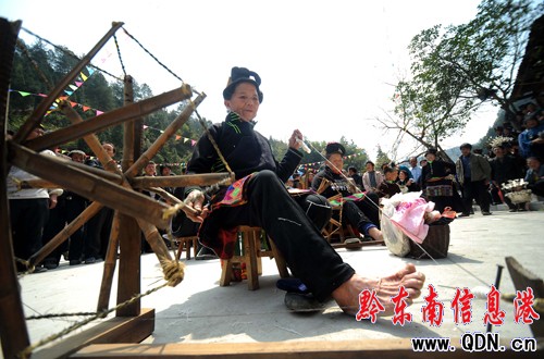 丹寨排調鎮岔河村,一名比賽選手在進行紡紗比賽