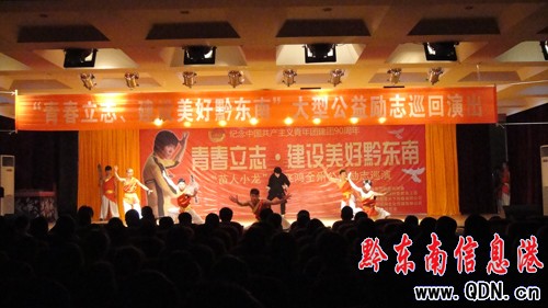 為紀(jì)念中國共產(chǎn)主義青年團建團90周年,結(jié)合黔東南州青少年新時期的思想動態(tài),團州委、州教育工委4月在全州開展“青春立志·建設(shè)美好黔東南”主題活動,活動中將邀請黔東南籍功夫影視明星王飛鴻在全州舉行校園巡回勵志演出。4月13日,王飛鴻及其表演團隊將丹寨作為十六個縣市的首發(fā)站,當(dāng)晚七點半準(zhǔn)時在丹寨青少年活動中心舉行。縣委常委、宣傳部長彭瑤,團丹寨縣委主持工作副書記洪萍同志出席了此次活動。丹寨縣第二中學(xué)、第三中學(xué)的近400名師生觀看了此次演出。