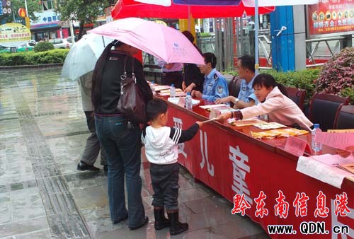 活動現場,6家單位聯合印制了防拐常識、連環畫、相關法律法規等資料6000余份,同時設立了宣傳展板和咨詢臺,雖然天空下著大雨,不過客觀、實用的宣傳內容還是吸引了不少過路群眾的目光。