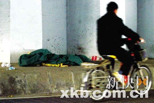 昨日上午9時許,記者在天河立交橋底看到,死者躺在橋下的人行道上,光著的腳已伸到馬路上。死者身穿黑色外套和褲子,看起來身體很單薄,身下墊著一床淺黃色被單,雙腿并攏,雙手呈抱頭狀。不遠處的角落里,零散放著幾張報紙和數件破舊的衣服。