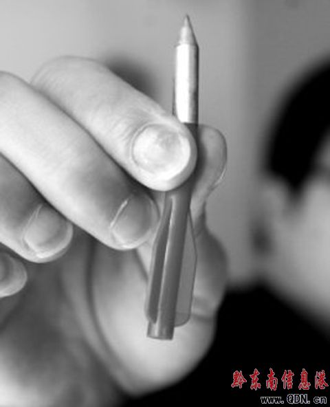 木板墻上留下很多洞孔,有類似釘子釘穿的痕跡。公司工作人員證實,這些都是歹徒用弩射擊的彈痕。記者看到,“子彈”是由3公分左右長的尖鋼釘和3公分左右長的螺旋狀紅色塑料連接而成。