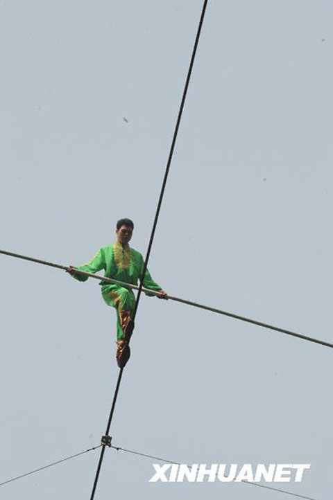 在2008年挑戰失敗后,新疆“達瓦孜”第七代年輕傳人賽買提·艾山25日再次向張家界天門山世界最大坡度的高空鋼絲發起挑戰。經過1小時7分鐘的艱難行走,賽買提·艾山最終挑戰成功。